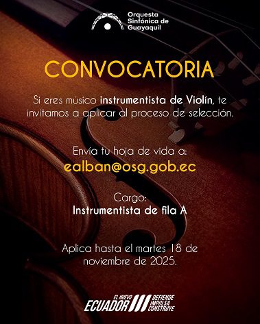 La Orquesta Sinfónica de Guayaquil abre convocatoria para músicos interesados en formar parte de nuestra planta orquestal. Postulaciones: Envío de hoja de vida a ealban@osg.gob.ec Fecha límite de postulación: martes 18 de noviembre de 2025 Audición: Fecha: Lunes, 24 de noviembre de 2025 Hora: Teatro Centro Cívico Repertorio: A. Mozart – Concierto para violín (a […]